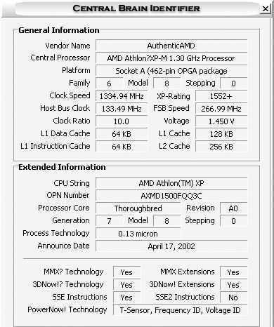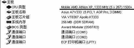 装好机器,迫不及待地打开电脑,听到“嘟”一声,这才定下心来。自检画面为AMD Athlon(TM)667MHz Processor,果然如JS所说。进入华硕A7V333的BIOS,把CPU频率设置改为手动,将CPU倍频设置成10,外频设为133MHz。保存退出,重新启动电脑,这时自检画面显示:AMD Athlon(TM)1333MHz Processor。平安进入了系统!用CBId软件测试,可以清楚看到该CPU的一些属性:AMD Athlon XP-M 1.3GHz Processor,Thorouhbred核心,0.13微米工艺制造,而且支持所有属于桌面版AthlonXP CPU的一切特性(图1)。可能是手头这块华硕KT333主板的频率偏高,XP-Rating显示的是1552+。而在AIDA32中则能够正常地显示出Mobile AMD AthlonXP1333MHz(5×267)1500+(图2)。该CPU的电压显示出只有1.45V,比新版毒龙的1.5V还低。而笔者所使用主板支持的最低CPU电压都是1.475V,用在它的上面算是给它加压了。