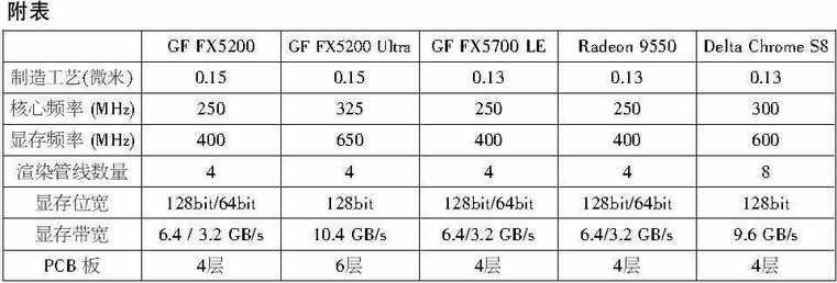 因此,顶点引擎和像素引擎必须彼此配合,互相依托;如果顶点管线数量不足,或者效率偏低,再强再快的像素引擎也会面临“无米之炊”断档之苦。兵马未动,粮草先行,有人戏称顶点引擎是GPU运算的“后勤部长”,也是颇有几分道理的。S8的4条顶点渲染管线,也比对手产品的规格要高出一截,连目前中端市场的主力FX5700和R9550都只有3条和2条顶点流水线,一旦遇见比较复杂场景的游戏画面,难免出现“青黄不接”的窘境。