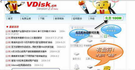 VDisk现在已经升级为2.0版本,为所有免费用户提供了100MB的存储空间,还可以通过购买充值卡对自己的“硬盘”进行扩张。我们首先需要进行注册,来获得它的使用权。
