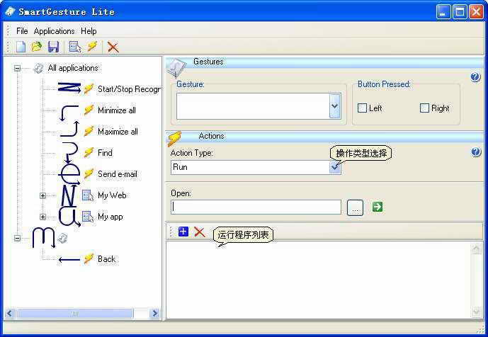 安装成功后运行SmartGesture Lite,在主界面左边窗口罗列出几种默认的鼠标手势(如图所示)。