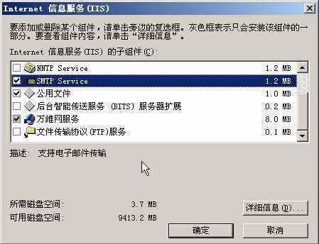 在Windows 2003服务器中,点击“开始→设置→控制面板”,运行“添加或删除程序”,在弹出的窗口中切换到“添加/删除Windows组件”页面。接着在“Windows组件向导”对话框中选中“应用程序服务器”选项,点击下方的“详细信息”按钮,在弹出的对话框中选中“Internet信息服务(IIS)”组件,然后点击“详细信息”按钮,最后选中“公用文件”、“SMTP Service”及“万维网服务”这三项(图1),点击“确定”按钮即可。