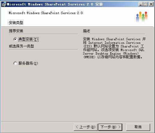 下载SharePoint Service2.0程序软件包,按照提示进行安装即可。不过,用户可在“安装类型”对话框中选择“典型安装”(图3),这样安装程序就会自动将IIS的默认网站配置成SharePoint工作组网站,否则,用户就要在IIS6管理器中手工配置SharePoint工作组网站。这是因为所有的Office 2003协同办公活动都是在SharePoint工作组网站基础上展开的,也就是说它是实现Office 2003协同办公的核心平台,必须在IIS中成功配置才行。