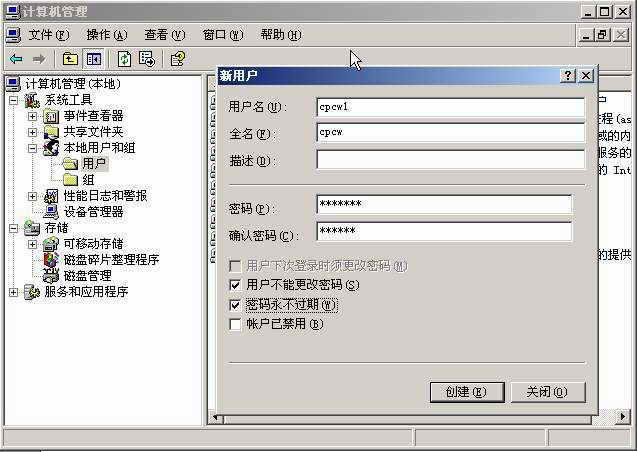在Windows 2003服务器中,依次进入“控制面板→管理工具→计算机管理”,在“计算机管理”对话框中依次展开“系统工具→本地用户和组→用户”,在右侧框体空白处,点击鼠标右键,选择“新用户”选项,弹出“新用户”对话框(图4),在“用户名”栏中输入“cpcw1”,然后设置用户密码,最后点击“创建”按钮即可。其他用户的账号的创建方法与此相同,这里就不再做介绍了。