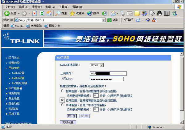 在TL-R410多功能宽带路由器的设置页面里,将网络参数→WAN口设置中的WAN口连接类型选择“PPPoE”(图1),在上网账号和口令处填入ADSL上网的账号和口令,再选中自动连接。
