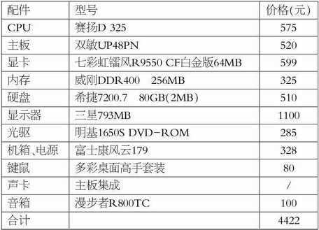 这套系统选用了赛扬D 325+双敏UP48PN主板的搭配。双敏UP48PN主板采用i848P芯片组,除了支持800MHz FSB和两个SATA接口,还集成了6声道CODEC。特别值得一提的是它针对CPU供电部分加强了散热设计。它在CPU插座周围的场效应管上加装了散热片,并用一个小的塑料盖将供电电路覆盖起来,同时用一个小风扇抽风迅速将热量带走。这对发热量大的赛扬D特别有用,能够起到保护周边元件的作用。因为主要针对普通应用,显卡采用了性价比很高的R9550显卡。内存选用了威刚,比现代兼容内存只贵一点点。如果选择DDR333内存,只便宜10元,实在没必要。硬盘不用多说,5年质保的希捷7200.7 80GB是最划算的。