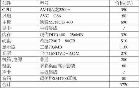 这套配置采用的是闪龙2200+搭配映泰M7NCG 400主板。映泰M7NCG 400主板采用nForce2 IGP加MCP芯片组,microATX小板,最高支持400MHz FSB,集成了MX440显卡,对于入门配置就不用再另购显卡了。主板也带有一个AGP插槽,方便以后升级显卡。目前上市的闪龙CPU全部是散装,因此需要另购散热风扇。AVC C86虽然外形普通,却曾经被AMD盒装处理器采用过,价位也容易接受。很多入门配置中采用的是40GB硬盘,不过现在40GB和80GB容量价差还不到100元,建议直接选购80GB硬盘,免得短时间内升级。在入门机型中,购买低档音箱还不如选购有品质的耳机,音响效果更好。
