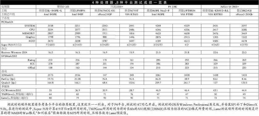 通过对这几套推荐配置的测试,可以感受到P4系统仍然拥有目前最强大的性能,HT、SSE3指令、双通道这些技术使得P4仍然是处理繁重任务和喜好游戏的用户的最佳选择。而Athlon 64系统虽然支持64位运算,但目前缺乏操作系统和相关软件的支持,还没有体现出64位计算的优势。在32位平台上Athlon 64系统性能已经与P4不相上下,随着厂商对64位系统支持的增强,Athlon 64将大放光彩。赛扬D无疑是目前性价比最高的平台,性能不低,超频性又好,价格也很容易接受,是入门用户的最佳选择。而新上市的闪龙,目前这几款产品性能还比不上赛扬D,但是价格便宜,非常适合预算有限的用户选择。