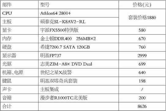 现在选购AMD64位处理器,当然选择主板和CPU套装是最划算的。并且现在很多套装都有Athlon64 2800+和3000+搭配不同芯片组的选择,无论你要何种处理器和何种芯片组的主板,都有相应的选择。这里选用的硕泰克套装,Athlon64 2800+的实际频率为1.8GHz,主板的芯片组为K8T800。由于我们主要将这套配置推荐给从事CAD或CG工作的用户,因此显卡采用的是可作Quadro FX500使用的宇派FX5500特供版,它在出厂时就已经改为Quadro FX500,不需再作任何修改,对普通用户非常方便。对于这一类用户,硬盘建议采用大容量120GB SATA硬盘,光驱采用志美8×DVD Dual,方便随时备份重要的文件。在机箱、键鼠等外设上,除了满足实用的要求,也力求个性张扬。