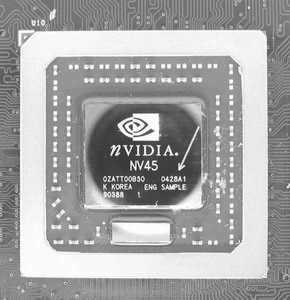 NVIDIA的第一批PCI Express接口显卡采用了一块长方形的HSI(High-Speed Interconnect)桥接芯片,它位于显卡的下侧靠近金手指处。在这块显卡上,我们没看到独立的HSI桥接芯片。将重重的散热器取下后,我们看到了这样的核心(见下图)。大家除了可以清楚地看到图中的NV45字样外(GPU上深色圆形为数码相机的镜头反射),还可以发现核心下部有一个没有任何标志的长方形芯片,这便是原来那块单独的HSI桥接芯片,只不过,在NV45架构中,将这块桥接芯片同GPU做在了同一块基板上。换句话说,NV45显卡,依旧不能算是完全意义上的原生PCI Express方案。