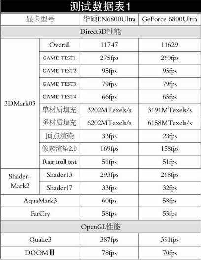 我们使用3DMark03、ShaderMark2、AquaMark3三个测试软件和游戏FarCry来测试显卡的游戏D3D性能,而游戏OpenGL性能方面,我们则使用DOOMⅢ和Quake3来进行测试。测试结果见测试数据表1。