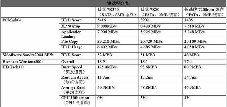 在测试中,我们使用了希捷7200.7 80GB硬盘作为系统盘;将7K250与7K80作为从盘,并且都只分一个主分区,使用NTFS格式进行格式化。这样可以保证待测的硬盘尽可能处于最佳状态,排除磁盘碎片对性能造成的影响。此外我们还采用了一款在市场中装机量很大、而且价格定位与日立相近的硬盘进行对比(测试结果见表)。