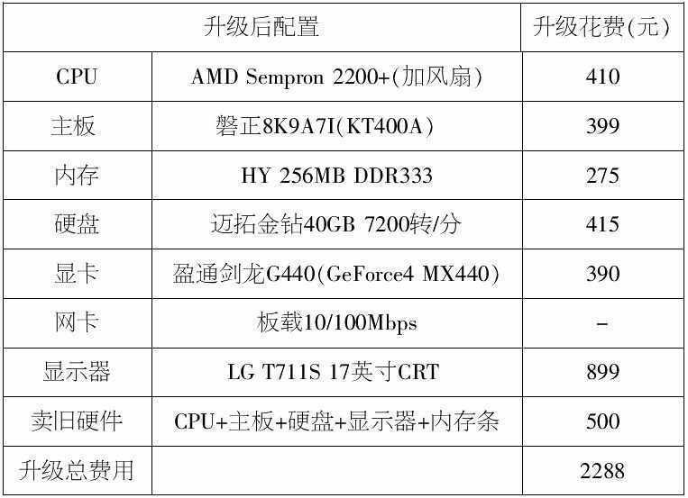 推荐理由:我的推荐方案采用AMD平台, 新的闪龙处理器性价比不错。主板采用的是磐正8K9A7I,北桥芯片为KT400A,南桥采用了VT8237,支持了SATA硬盘传输规范以及RAID 0、1,虽然这些功能在升级中用不上,但399元的价格是相当超值的。接下来将内存升级为256MB DDR333,显卡升级为盈通剑龙G440(GeForce4 MX440),它的显存采用了现代2.8ns DDR颗粒,容量为64MB,显存位宽为128bit。显示器采用LG的T711S,带宽110MHz、点距0.25mm。算上卖掉的旧硬件,这套方案实际升级花费只要2288元。