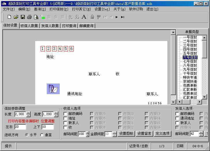 软件评点:因为笔者在机关事业单位工作,平时邮寄下发文件、简报等资料较频繁,所以经常要批量打印信封。以前用Word设计信封比较麻烦,特别是要把邮政编码准确无误地设置到信封上的框框里,操作十分烦琐。而这款超级信封打印工具软件里预存了几乎所有的标准信封,只要选好信封大小,设置好打印内容就可以轻松批量打印了。它还支持了Office97/2000/XP的数据导入、导出,所有打印内容(邮政编码、地址、单位等)一应俱全,可以说是单位大批量发送信函、管理客户的必备工具。