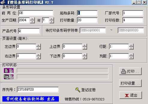 软件评点:现在很多企业都准备对自己的产品实行条形码管理,可是条形码打印机的价格不菲,让许多小单位望而却步,这时寻找一款合适的免费条形码打印软件可以说是一个比较合理的选择。而常州搜易电脑软件部出品的“搜易条形码打印机”,就是一款适合商业用途的条形码设计和打印软件。它是按照国家39条形码标准设计,只需要输入相应的日期、企业和产品代码等就可以自动转为与之对应的条形码并打印出来。软件会自动根据条形码数量和纸张大小调节打印机设置,打印出来的条形码可用于产品防伪跟踪、售后标识和批号识别区分等。