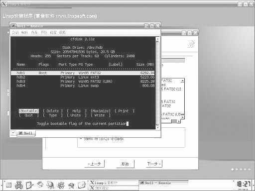 和常见的Linux发行版一样,首先涉及到的还是分区。该系统采用的分区工具叫cfdisk,有点像Windows下的Fdisk(图2),按照通行的安装方法完成分区,非常简单。