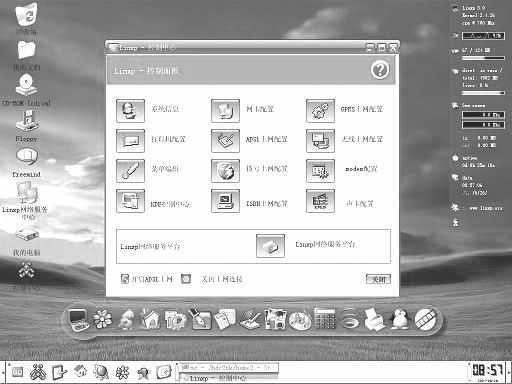拿出光盘用硬盘引导系统,选Linxp进入该系统。界面也和Windows相似,而且启动时系统就进入了SoftNet网络服务平台,这是因为安装IE6.0及Office2000等Windows应用程序要通过该网络服务平台。