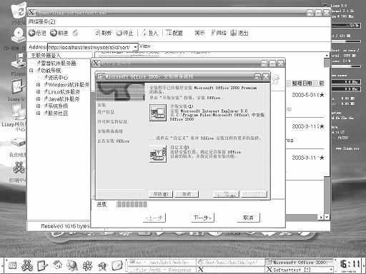在SoftNet中选“安装Office2000 ”,放入Office2000光盘后,就像我们在Windows下安装Office2000一样操作 (设定过程可能会长一些,设定中再次弹出 Office2000安装程序就算大功告成,如图5)。最后点下一步出现桌面向导,全选后按“加入”,桌面出现 Word、Excel、Access、OutLook、PowerPoint等Office组件的图标,Office2000安装完成。