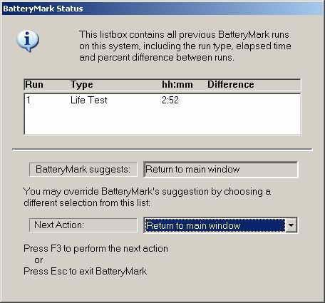 BatteryMark是一款专业的电池使用时间模拟测试软件,不仅较权威,而且测试结果也很精确。BatteryMark提供两种测试方案:Conditioning Run和Life Test。Conditioning Run是以最“残酷”的方式快速地将电池的电量耗光。Life Test相对于Conditioning Run多了一个Think engine(即模拟实际使用的过程),因而Life Test的测试时间要比Conditioning Run长30%~40%。每过一段时间Battery Mark就会将测试的数据自动保存到你设定的目录下面,当电池彻底到消耗殆尽的时候,笔记本电脑自动关闭前的最后一次保存结果就将作为最终测试结果(左图)。