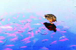 图片说明:冬日的湖面结了一层薄冰,一只野鸭望着脚下的大群游动的鱼,却没有口福。