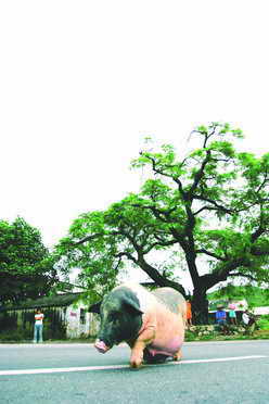 图片说明:广东省阳江的一条村落,叫北政村,村很宁静,美丽。一头怀孕快生小猪的大肥母猪,沿着马路中间的白线堂而皇之走着,想必这里的猪都是敞着喂吧?