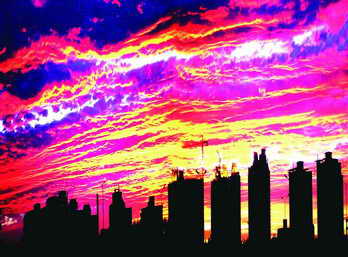 主题:傍晚的都市上空有着厚厚的云层,在夕阳的映照下显现出凝重的赤色,气势磅礴地翻滚着,好像动画片《大闹天宫》中神兵集聚的场景。(摄影/easilyweb)