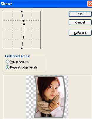 第六步:现在我们来弯曲图像使之看起来更加自然。在Layers调板中单击图像图层;然后选择“Filter(滤镜) →Distort(扭曲) →Shear(切变)”在显示的对话框中做如图5所示的调整。使图像弯曲。单击“OK”结束。最后调整黑色图层和图像图层的位置使它们看起来更加自然。然后选择一张自己喜欢的图片作为背景。这样一张艺术照片就做好了,满意吗?