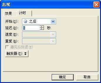 Step2 再选中第三个三角形,设置“出现”动画。然后双击任务窗格“直角三角形3”动画右侧的“时钟”图标,展开“出现”对话框(图4),切换到“计时”标签下,将“开始”选项设置为“之后”,“延迟”设置为“1”,确定返回。