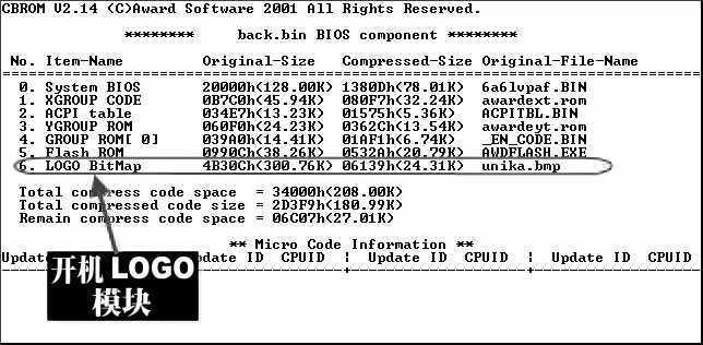 阿萌:不同的BIOS,它的名称不一样。如果是Award BIOS,你只要在DOS提示符下输入“CBROM BIOS.bin /D”后(这里BIOS.bin为主板BIOS文件名,它和CBROM在同一文件夹内),在打开的BIOS文件信息中有一个名为“LOGO BitMap”的模块(图1)。它就是全屏开机画面文件模块。