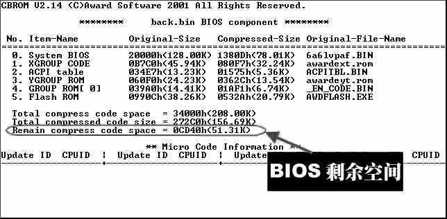 阿萌:别急,我们先要查看一个BIOS的剩余空间够不够。在DOS下用CBROM.EXE程序命令“CBROM Back.bin /D”查看修改后的Back.bin文件,显示信息中“Remain compress code space”的值表示BIOS剩余空间的大小(图3)。这个值应至少大于3KB,如果不够,还得删除其他多余的模块,释放更多的空间存放开机画面文件。