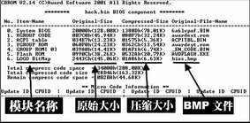 然后在DOS提示符下键入“CBROM Back.bin /logo Bios.bmp”命令,将制作好的BMP图片压缩并写入主板BIOS文件中,压缩后的文件大小一般为压缩前的4.5%(压缩率会根据图片的复杂程度有所不同)。这时再用“CBROM Back.bin /D”查看BIOS文件组成,你就会发现制作好的Bios.bmp文件已经成功写入BIOS文件中了(图4)。