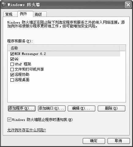 在“例外”选项卡中能够添加可以访问网络的“例外程序”和服务,比如MSN Messenger、QQ等等(图1)。此外,点击“添加程序”按钮还可以添加其他要访问网络的程序,比如草莓最喜爱的泡泡堂、UC等;点击“添加端口”按钮可以添加要访问网络的端口号,包括TCP和UDP端口。