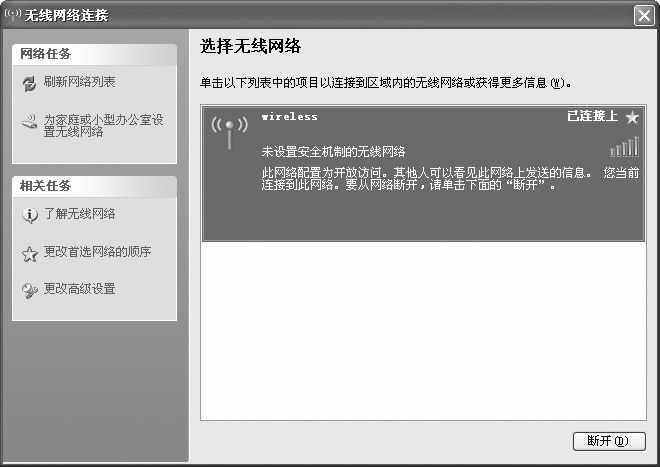 在未安装SP2的Windows XP中使用无线网络的时候,如果要断开连接会非常麻烦,因为右键点击该连接出现的菜单中根本没有“断开”选项,只有“禁用”、“修复”等选项,果冻为此也三番五次地发过牢骚。在安装了SP2之后,对无线网络状态的控制得到了极大改善,系统专门提供了一个查看无线网络连接的窗口。