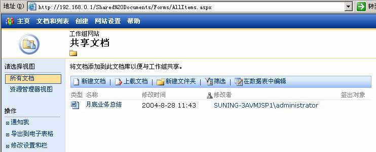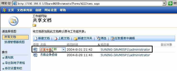 提示:小胖上传的Word共享文档,并不是保存在自己的电脑中,而是保存在SharePoint服务所在的Windows 2003服务器中。SharePoint服务对这些共享文档进行统一管理和维护,并不需要其他用户的干预。不管小编身在何地,都可以登录到SharePoint工作组网站来进行协同修改。
