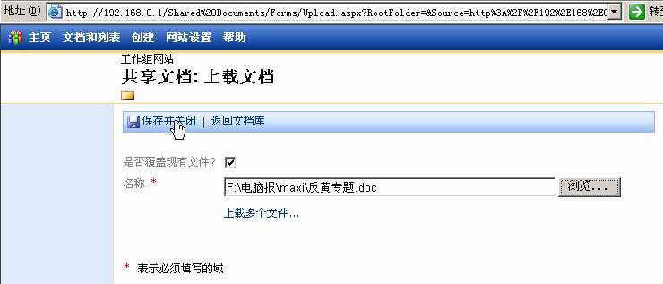 点击页面左侧的“共享文档”链接,进入共享文档区域,接着点击“上载文档”按钮(图1),进入“上载文档”对话框,点击“浏览”按钮后,弹出“选择文件”对话框,找到“反黄专题.doc”文件,点击“打开”按钮,最后点击“保存并关闭”按钮(图2)完成专题文档的上传。这样就将专题文档保存在SharePoint服务器中了。