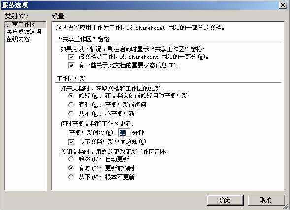 共享文档每隔一段时间都要进行更新,默认是每10分钟一次,如果不能满足需要,用户还可自行设置。在Word 2003文档右侧的“共享工作区”面板中,点击下方的“选项”链接,弹出“服务选项”对话框,在“共享工作区”设置页面中找到“何时获取文档和工作区更新”选项(图5),在下面的输入栏中指定合适的值即可,最后点击“确定”按钮。不断地更新共享文档,使得协同办公的小编们可以及时了解彼此的工作进度以及修改内容。