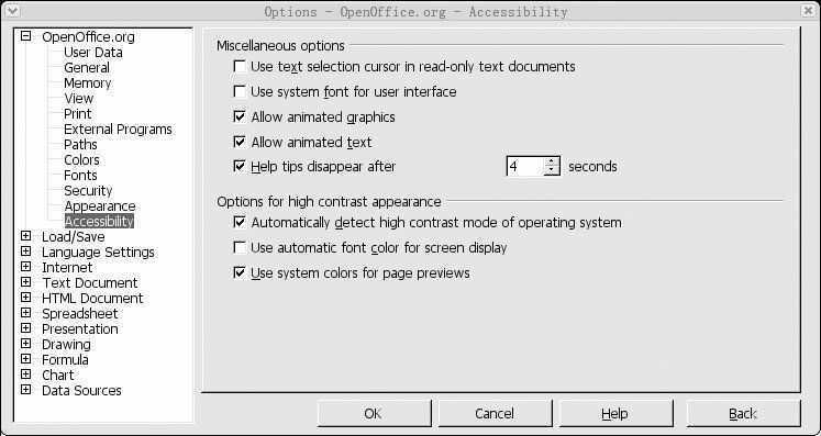 在左边显示区内展开“OpenOffice.org”选项,再点击“Accessibility”(辅助功能),在右边区域中会看到其中有“Use System font for use Interface ”(采用使用者界面的系统字体)前的复选框内的“√”号取消,然后按“确定”按钮即可。