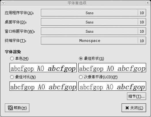 点开始菜单→首选项→“字体”,会弹出“字体设置”的对话框,把其中的“应用程序字体”、“桌面字体”、“窗口标题字体”的Sans字体(图2)改为“AR PL Sungtil GB”就OK了。