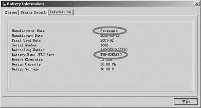 除了可以用观察外观的方法来鉴别“兼容”电池与原装电池之外,还可以通过实际试用来获得更准确的电池参数和了解电池的实际性能。把上述的“兼容”电池和原装电池先后安装在一台T23笔记本电脑上后,只用电池供电开机,进入系统后,单击任务栏右侧的绿色电池图标(需要安装IBM ThinkPad Battery MaxiMiser后才会出现),选择“Battery Information”,在弹出的电池信息页面中选择“Information”。可以看到,使用“兼容”电池在“Manufacturer Name”后面显示的是“PS”,而使用原装电池则一般显示为“SANYO”(三洋)或“Panasonic”(松下)。在“Battery Name(FRU Part)”一栏中,使用原装电池则显示为“IBM-02K6710”(图3,后面的FRU号因具体电池的不同而不同),而使用“兼容”电池在字母“IBM”之后没有FRU号,显示为“IBM-COMPATIBLE”(图4),意思是“IBM兼容电池”。另外,“兼容”电池的标准设计容量与原装电池的也略有差异,使用“兼容”电池显示为38.95Wh,而使用原装电池则显示为38.88Wh。