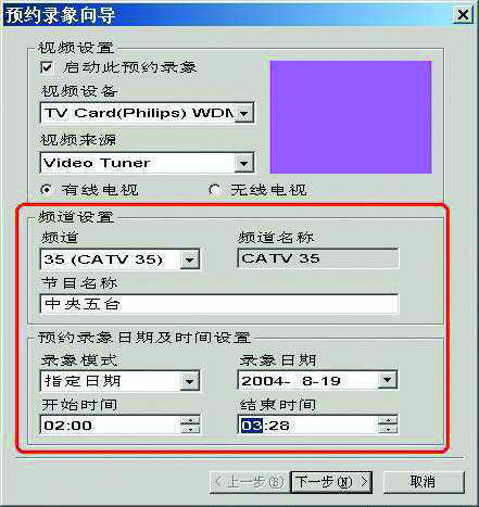 3.点击“预约录像”按钮后,会弹出一个操作向导窗口(图1),你只要选好准备录制的电视频道、比赛的开始/结束时间,便可进入下一步设置。