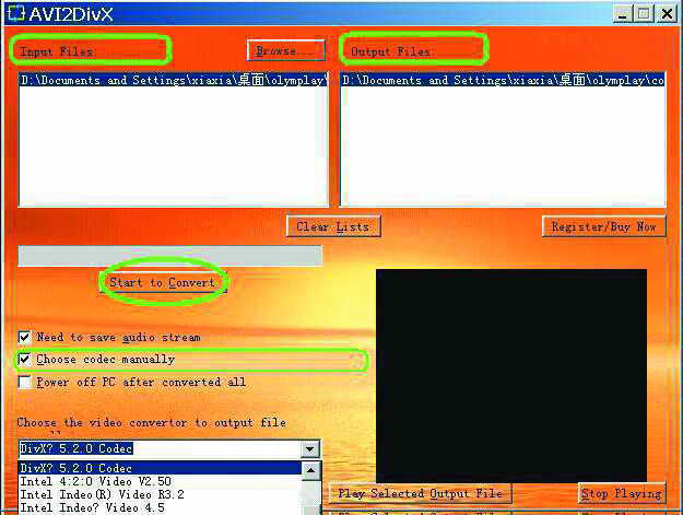 3.然后勾选界面中间的“Choose Codec Manually”(手工选择编码)一项,并在下拉菜单中选择前面已经安装好的DivX 5.2视频编码,再点击“Start to Conver”按钮(即转换按钮),开始进行文件格式的转换。