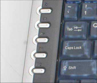掀开上盖,看见735E的内部设计中规中矩,比较简洁,虽然说不上漂亮时尚,但也朴素大方。键盘外的多余按钮只有电源开关和左边一列快捷键按钮。735E采用了半透明蓝色按键的全尺寸键盘,符合人体工程学的设计,键程较长,手感舒适,不过整体偏软。
