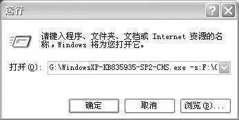 G:\WindowsXP-KB835935-SP2-CHS.exe –s:F:\WinXP (如图)。