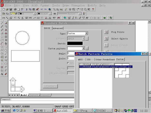 本人使用AutoCAD 2000英文版,下文以此为例,对如何在hatch pattern palette 菜单的custom选项中加入自定义填充图案进行一下研究,找到一种方法供参考。不过我认为应该还有它法。