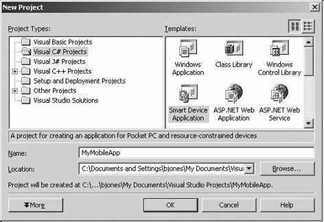 你还可以看到这个对话框里列表显示了你的电脑上所安装的设备。你可以看到我的Pocket PC设备是一个模拟器。如果你没有移动设备,还是可以使用模拟器来建立应用程序,就像这个例子里你要做的那样。