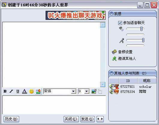 音频设备设置完毕后就可以开始实现与好友进行语音群聊了。在UC主窗口中右击鼠标,在弹出的快捷菜单中选择“多人世界”,在随即弹出的窗口中选择欲批准进入该语音群中的好友(注意:最多只限10个好友在同一个语音群中,另外,在聊天时也可以即时添加其他好友)。将你的好友添加进来后,在群聊天窗口中勾选“参加语音聊天”选项,你就可以在群中说话了(如图),同时也能听到群中其他好友的声音。