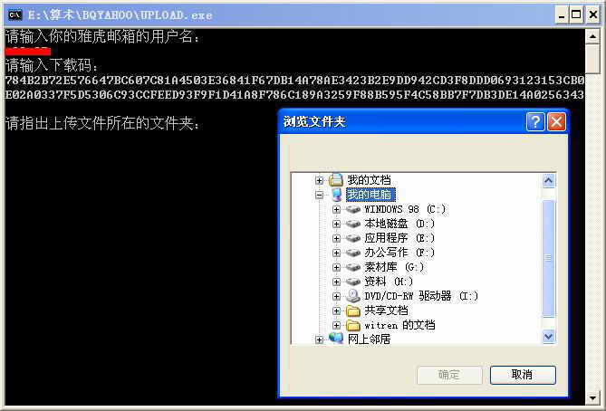 再次进入BQYAHOO文件夹,找到文件名为UPLOAD的可执行程序,双击它运行UPLOAD.exe文件。在“请输入你的雅虎邮箱的用户名”和“请输入下载码”中,分别输入雅虎邮箱的用户名和生成的登录码。