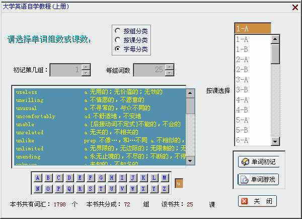 提示:如果你想按字母进行分类,可在下方26个字母中进行选择,所选的单词同样会出现在单词区内,此分类尤其适用于复习阶段。