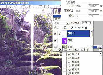 第四步:将图层2透明度设为约30%,然后使用自由变换工具,调整角度,使之符合太阳光线的角度。然后将图层2复制3个副本,对各个副本的透明度、角度、长度、宽度进行一定调整,使之看起来真实、自然,富有变化。最后将图层2及其副本链接起来,选择图层→合并链接图层。对合并后的图层2可再复制1~2个副本,对其透明度、角度、长度加以调整。这样作品就完成了,对比一下,显得神秘多了吧。