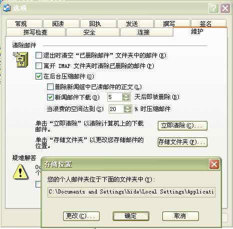 打开OE,单击“工具→选项→维护”选项卡中的“存储文件夹”。选定文件夹路径,按“Ctrl+C”键复制路径(如图),然后点击“取消”,关闭“存储位置”和“维护”对话框。