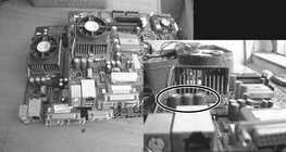 学校有一个投入使用了三年的电脑机房,开学检修时发现有10多台XX品牌的国产品牌电脑罢工了。主要故障表现:开机主板电源灯亮,无任何动作,显示器不亮。无任何警报声。初步估计是主板故障,拆开主机观察,发现问题所在。如图1:在CPU旁边的几个大电容已经鼓起来了,部分已经流出电解液。